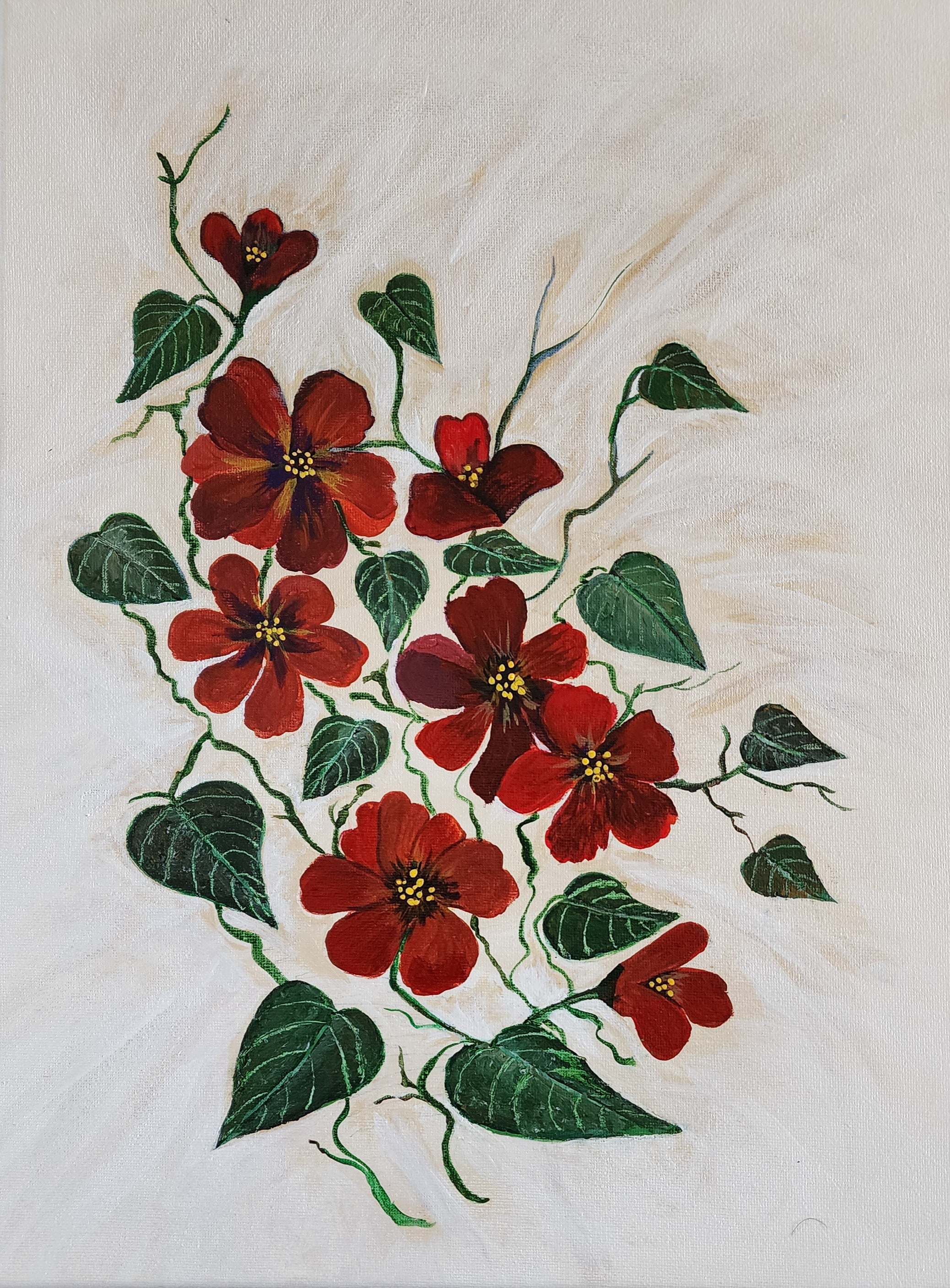 Graceful yet grounded, Rooted in Thought features a cascading spray of deep red pansies intertwined with winding pothos vines, set against a marbled beige background. Painted in acrylic on canvas, this composition invites quiet reflection. Symbolizing remembrance and loving thoughts, pansies speak to memory and emotion, while pothos—known for its resilience and ever-reaching growth—embodies endurance and vitality.