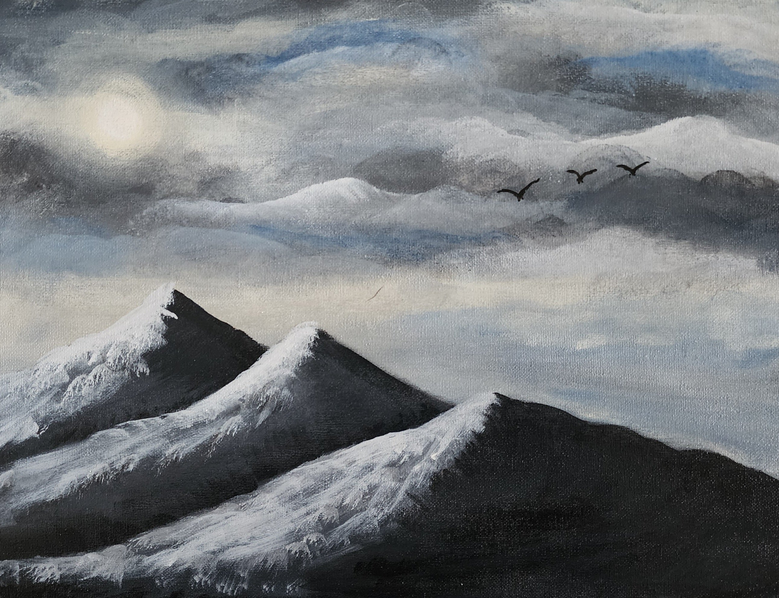 Quiet and commanding, Above the Silence captures three snow-capped mountain peaks rising into a moody, clouded sky. Rendered in shades of blue, grey, black, and white, the palette evokes the stillness, solitude, and strength found in nature’s highest places.